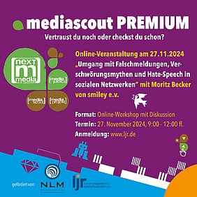 Der mediascout PREMIUM wendet sich an haupt- und ehrenamtlich Aktive in der Jugendarbeit und findet am 27.11.2024 von 9:00 bis 12:00 Uhr online statt. Die Teilnehmenden haben im Anschluss die Möglichkeit, individuelle Fragestellungen zum Thema mit dem Referenten zu besprechen.