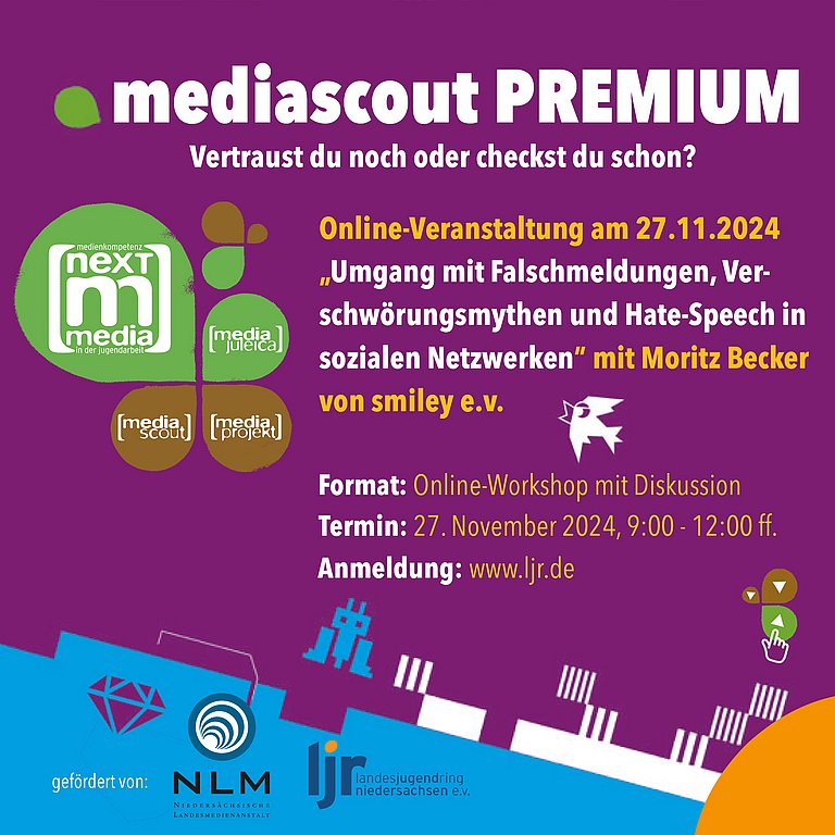 Wer eine vertiefte Auseinandersetzung mit diesem Thema sucht, nimmt an dem Online-Workshop mediascout PREMIUM »Umgang mit Falschmeldungen, Verschwörungsmythen und Hass in sozialen Netzwerken« am 27.11.2024 teil.
